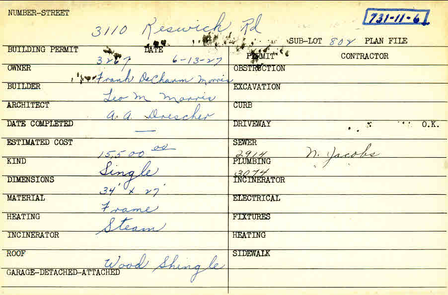 3110 Keswick Road Shaker Heights, OH 44120 PARCEL ID: 731-11-006 Building Permit Date: 06-13-1927 Plan File Number: 0 Neighborhood: Ludlow Owner: Morris, Frank DeCharm Builder: Morris, Leo M. Architect: Drescher, A. A. Estimated Cost: 15500 Kind: Single, Single Residence or Dwelling Material: Frame Heating: Steam Roof: Wood Shingle Card Available: yes |