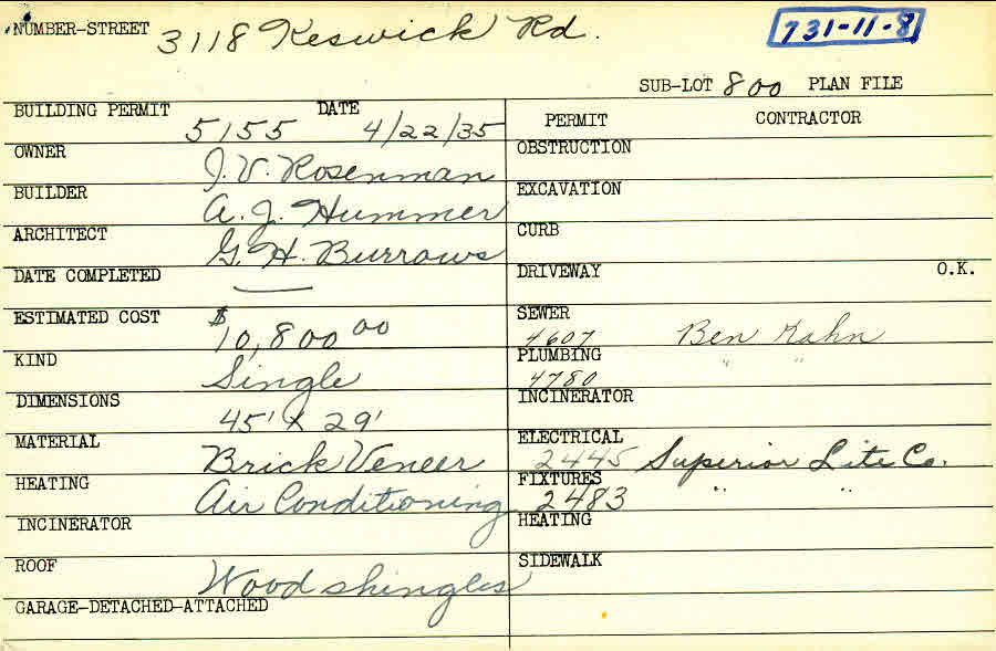 3118 Keswick Road Shaker Heights, OH 44120 PARCEL ID: 731-11-008 Building Permit Date: 04-22-1935 Plan File Number: 0 Neighborhood: Ludlow Owner: Rosenman, J. V. Builder: Hummer. A. J. Architect: Burrows, G. H. Estimated Cost: 10800 Kind: Single, Single Residence or Dwelling Material: Brick Veneer Heating: Air Conditioned Roof: Wood Shingle |