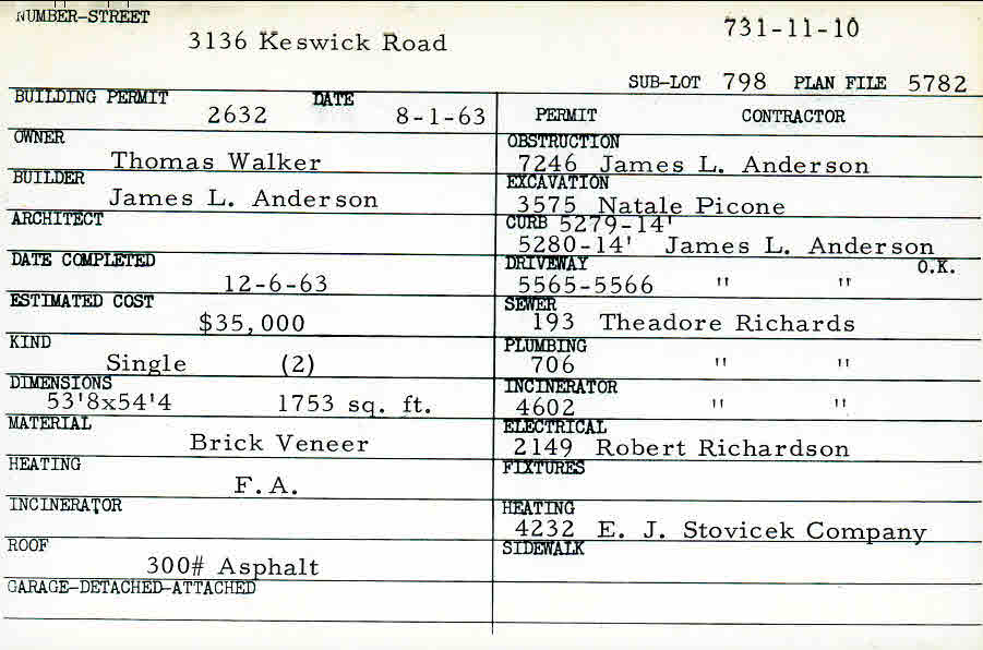3136 Keswick Road Shaker Heights, OH 44120 PARCEL ID: 731-11-010 Building Permit Date: 08-01-1963 Plan File Number: 896 scanned, 5782, 5363, 5644 Microfilm Roll: Roll012, Roll#78, Roll#73, Roll#76 Neighborhood: Ludlow Owner: Walker. Thomas Builder: Anderson, James L. Estimated Cost: 35000 Date Completed: 12-06-1963 Kind: Single, Single Residence or Dwelling (2) Material: Brick Veneer Heating: Forced Air Roof: Asphalt |