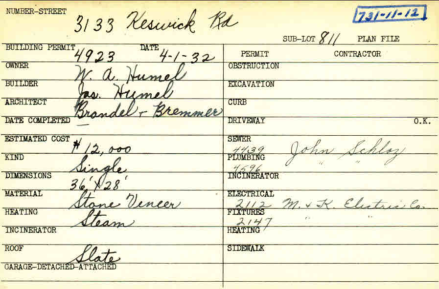 3133 Keswick Road Shaker Heights, OH 44120 PARCEL ID: 731-11-012 Building Permit Date: 04-01-1932 Plan File Number: 12511 Microfilm Roll: NewRoll#13 Neighborhood: Ludlow Owner: Humel, W. A. Builder: Humel, James Architect: Brandel and Bremmer Estimated Cost: 12000 Kind: Single, Single Residence or Dwelling Material: Stone Veneer Heating: Steam Roof: Slate |
