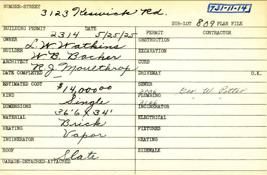 3123 Keswick Road Shaker Heights, OH 44120 PARCEL ID: 731-11-014 Building Permit Date: 05-25-1925 Plan File Number: 0 Neighborhood: Ludlow Owner: Watkins, L. W. Builder: Bacher, W. B. Architect: Moulthrop, R. J. Estimated Cost: 14000 Kind: Single, Single Residence or Dwelling Material: Brick Heating: Vapor Roof: Slate Card Available: yes |