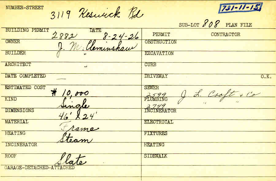3119 Keswick Road Shaker Heights, OH 44120 PARCEL ID: 731-11-015 Building Permit Date: 08-24-1926 Plan File Number: 0 Neighborhood: Ludlow Owner: Cleminshaw, J. M. Builder: Cleminshaw, J. M. Architect: Cleminshaw, J. M. Estimated Cost: 10000 Kind: Single, Single Residence or Dwelling Material: Frame Heating: Steam Roof: Slate Card Available: yes |