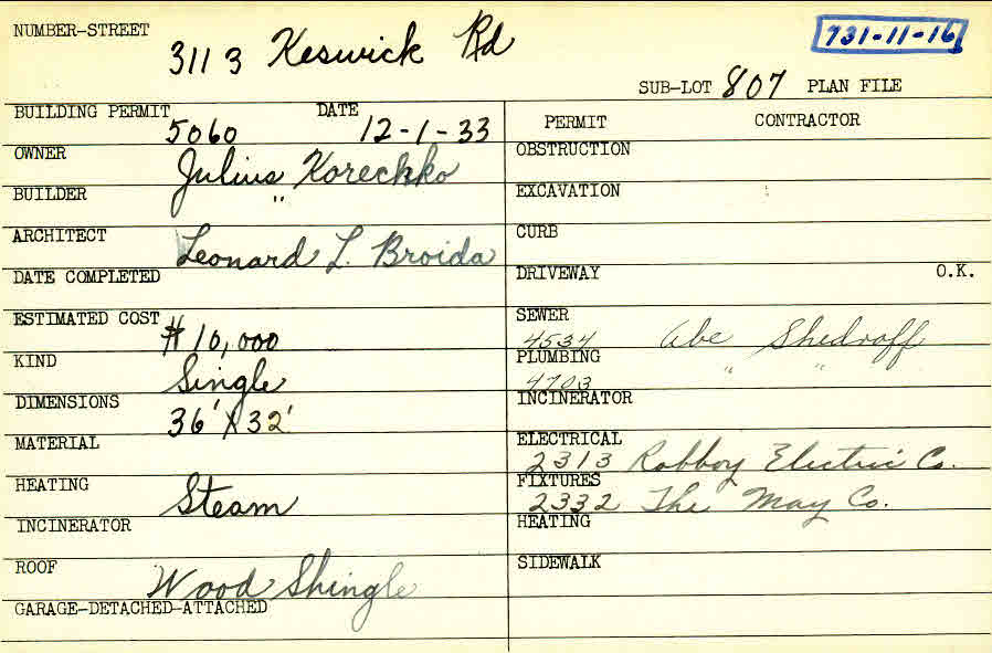 3113 Keswick Road Shaker Heights, OH 44120 PARCEL ID: 731-11-016 Building Permit Date: 12-01-1933 Plan File Number: 0 Neighborhood: Ludlow Owner: Korechko, Julius Builder: Korechko, Julius Architect: Broida, Leonard L. Estimated Cost: 10000 Kind: Single, Single Residence or Dwelling Heating: Steam Roof: Wood Shingle |