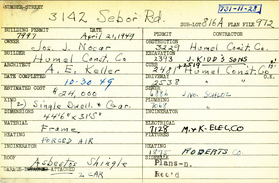3142 Sebor Road Shaker Heights, OH 44120 PARCEL ID: 731-11-028 Building Permit Date: 04-21-1949 Plan File Number: 972, 6309 all scanned Microfilm Roll: Roll012, Roll085 Neighborhood: Ludlow Owner: Nocar, Joseph J. Builder: Humel Construction Company Architect: Keller, Arthur Emil Estimated Cost: 24000 Date Completed: 10-30-1949 Kind: Single Dwelling and Garage (2) Material: Frame Heating: Forced Air Roof: Asbestos Shingles Garage: attached 2 car |
