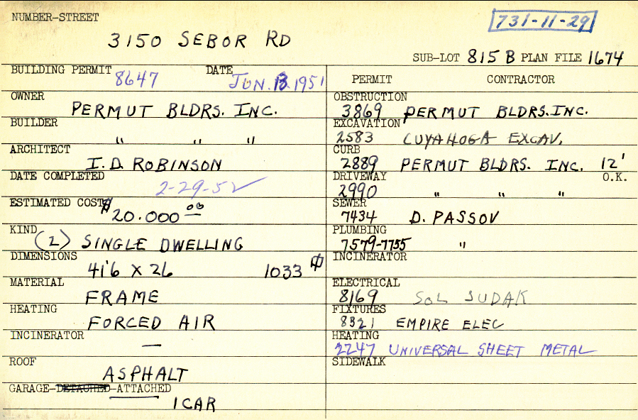3150 Sebor Road Shaker Heights, OH 44120 PARCEL ID: 731-11-029 Building Permit Date: 06-13-1951 Plan File Number: 1674 all scanned Microfilm Roll: Roll025, Roll026 Neighborhood: Ludlow Owner: Permut Builders Inc. Builder: Permut Builders Inc. Architect: Robinson, I. D. Estimated Cost: 20000 Date Completed: 02-29-1952 Kind: Single, Single Residence or Dwelling (2) Material: Frame Heating: Forced Air Roof: Asphalt Garage: attached |