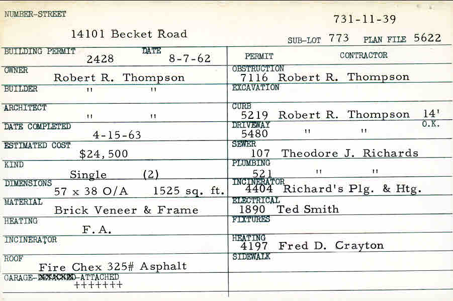 14101 Becket Road Shaker Heights, OH 44120 PARCEL ID: 731-11-039 Building Permit Date: 08-07-1962 Plan File Number: 5622 Microfilm Roll: Roll#76 Neighborhood: Ludlow Owner: Thompson, Robert R. Builder: Thompson, Robert R. Architect: Thompson, Robert R. Estimated Cost: 24500 Date Completed: 04-15-1963 Kind: Single, Single Residence or Dwelling (2) Material: Brick Veneer and Frame Heating: Forced Air Roof: 325# Asphalt Garage: attached |