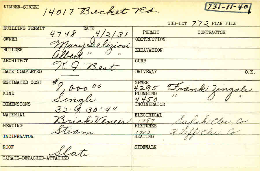 14017 Becket Road Shaker Heights, OH 44120 PARCEL ID: 731-11-040 Building Permit Date: 04-02-1931 Plan File Number: 0 Neighborhood: Ludlow Owner: Deliziosi, Mary Builder: Deliziosi, Albert Architect: Best, Karl J. Estimated Cost: 8000 Kind: Single, Single Residence or Dwelling Material: Brick Veneer Heating: Steam Roof: Slate |