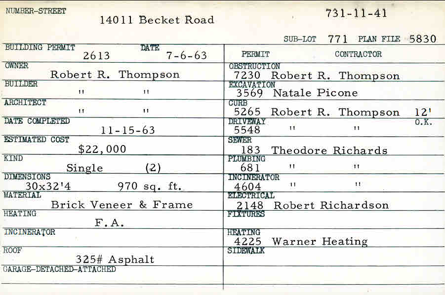 14011 Becket Road Shaker Heights, OH 44120 PARCEL ID: 731-11-041 Building Permit Date: 07-06-1963 Plan File Number: 5830 Microfilm Roll: Roll#79 Neighborhood: Ludlow Owner: Thompson, Robert R. Builder: Thompson, Robert R. Architect: Thompson, Robert R. Estimated Cost: 22000 Date Completed: 11-15-1963 Kind: Single, Single Residence or Dwelling (2) Material: Brick Veneer and Frame Heating: Forced Air Roof: 325# Asphalt |
