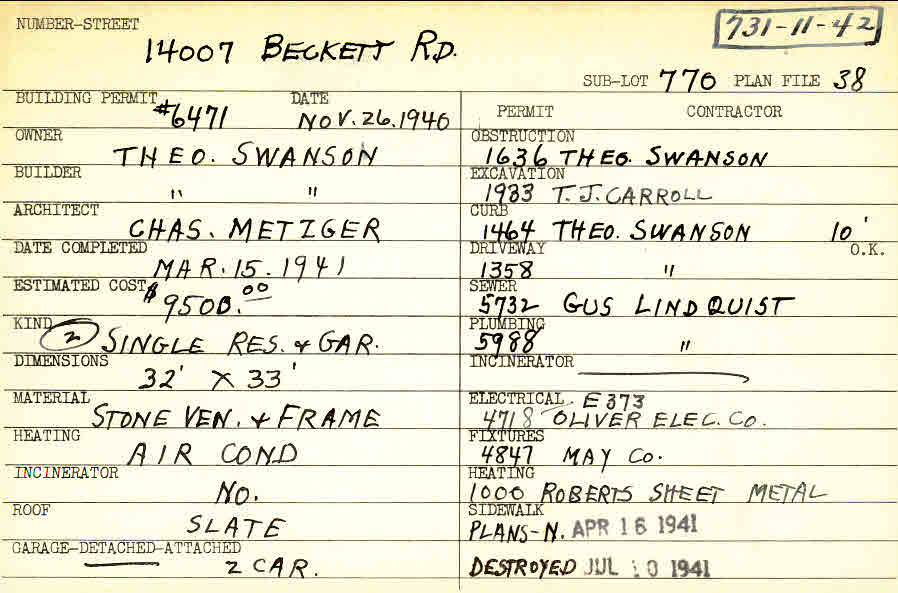 14007 Becket Road Shaker Heights, OH 44120 PARCEL ID: 731-11-042 Building Permit Date: 11-26-1940 Neighborhood: Ludlow Owner: Swanson, Theodore Builder: Swanson, Theodore Architect: Metzger, Charles A. Estimated Cost: 9500 Date Completed: 03-15-1941 Kind: Single Dwelling and Garage (2) Material: Stone Veneer and Frame Heating: Air Conditioned Roof: Slate Garage: detached 2 car Blueprints: no blueprints on microfilm |