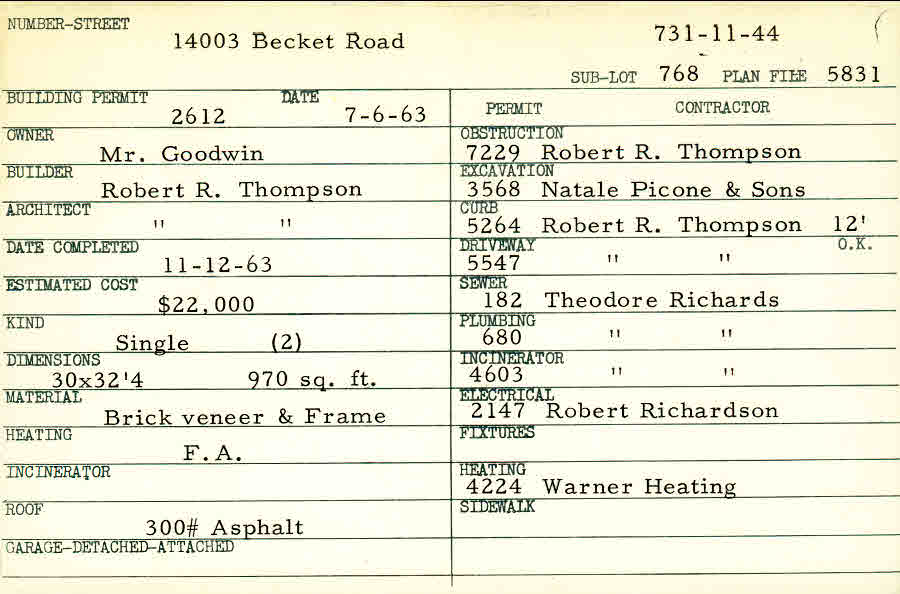 14003 Becket Road Shaker Heights, OH 44120 PARCEL ID: 731-11-044 Building Permit Date: 07-06-1963 Plan File Number: 5831 Microfilm Roll: Roll#79 Neighborhood: Ludlow Owner: Goodwin, Mr. Builder: Thompson, Robert R. Architect: Thompson, Robert R. Estimated Cost: 22000 Date Completed: 11-12-1963 Kind: Single, Single Residence or Dwelling (2) Material: Brick Veneer and Frame Heating: Forced Air Roof: 300# Min Asphalt |