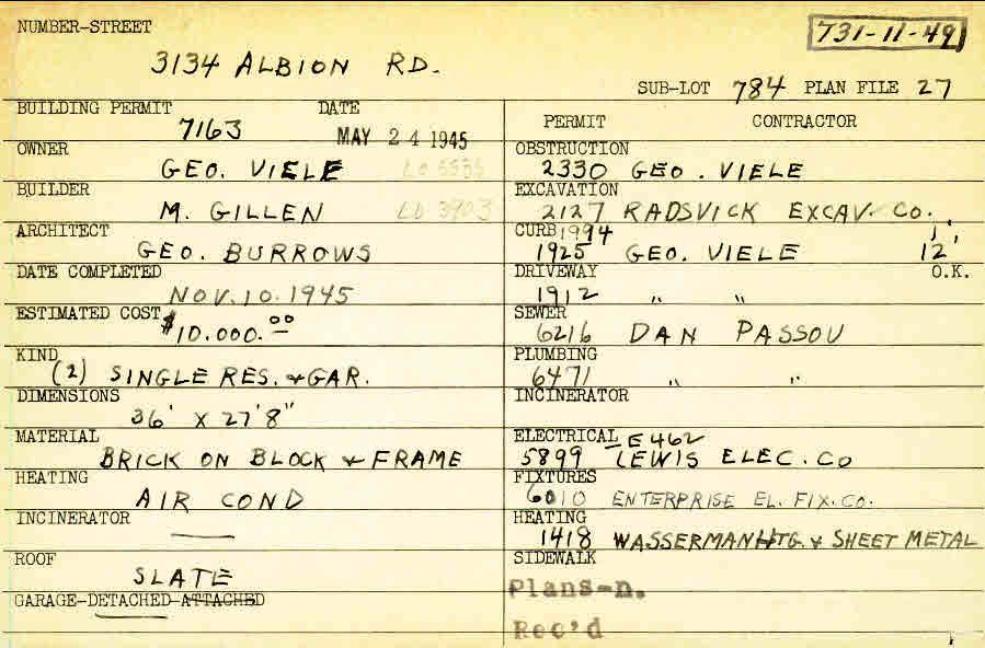 3134 Albion Road Shaker Heights, OH 44120 PARCEL ID: 731-11-049 Building Permit Date: 05-24-1945 Plan File Number: 27 scanned, 5692 Microfilm Roll: Rol001, Roll#77 Neighborhood: Ludlow Owner: Viele, George Builder: Gillen, M. Architect: Burrows, George Estimated Cost: 10000 Date Completed: 11-10-1945 Kind: Single, Single Residence or Dwelling (2) Material: Brick on Block & Frame Heating: Air Conditioned Roof: Slate Garage: detached Card Available: Yes |  |