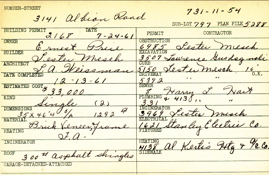 3141 Albion Road Shaker Heights, OH 44120 PARCEL ID: 731-11-054 Building Permit Date: 07-24-1961 Plan File Number: 5288 Microfilm Roll: Roll#72 Neighborhood: Ludlow Owner: Price, Ernest Builder: Mesch, Lester Architect: Weissman, L. A. Estimated Cost: 33000 Date Completed: 12-13-1961 Kind: Single, Single Residence or Dwelling (2) Material: Frame, Brick Veneer Heating: Forced Air Roof: 300# Min Asphalt |  |