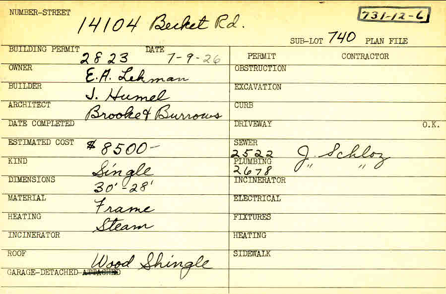 14104 Becket Road Shaker Heights, OH 44120 PARCEL ID: 731-12-006 Building Permit Date: 07-09-1926 Plan File Number: 0 Neighborhood: Ludlow Owner: Lehman, E. A. Builder: Humel, J. Architect: Brooke and Burrows Estimated Cost: 8500 Kind: Single, Single Residence or Dwelling Material: Frame Heating: Steam Roof: Wood Shingle Garage: detached |