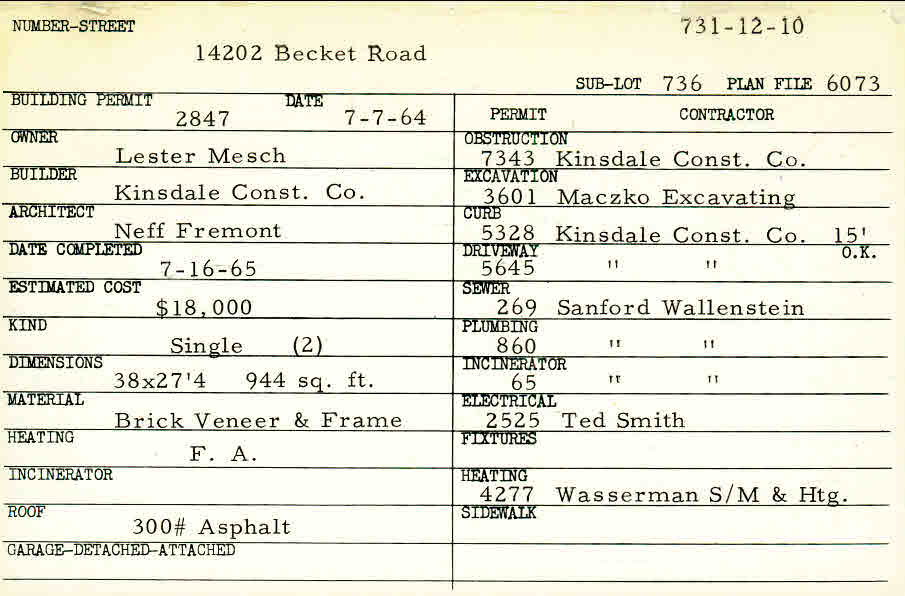14202 Becket Road Shaker Heights, OH 44120 PARCEL ID: 731-12-010 Building Permit Date: 07-07-1964 Plan File Number: 6073 Microfilm Roll: Roll#69, Roll#81 Neighborhood: Ludlow Owner: Mesch, Lester Builder: Kinsdale Construction Company Architect: Neff Fremont Estimated Cost: 18000 Date Completed: 07-16-1965 Kind: Single, Single Residence or Dwelling (2) Material: Brick Veneer and Frame Heating: Forced Air Roof: 300# Min Asphalt |