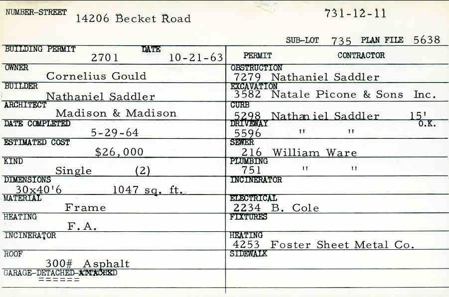 14206 Becket Road Shaker Heights, OH 44120 PARCEL ID: 731-12-011 Building Permit Date: 10-21-1963 Plan File Number: 5638 Microfilm Roll: Roll#76 Neighborhood: Ludlow Owner: Gould, Cornelius Builder: Saddler, Nathaniel Architect: Madison and Madison Estimated Cost: 26000 Date Completed: 05-29-1964 Kind: Single, Single Residence or Dwelling (2) Material: Frame Heating: Forced Air Roof: 300# Min Asphalt Garage: detached |