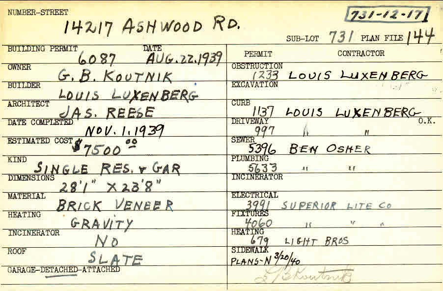 14217 Ashwood Road Shaker Heights, OH 44120 PARCEL ID: 731-12-017 Building Permit Date: 08-22-1939 Neighborhood: Ludlow Owner: Koutnik, G. B. Builder: Luxenberg, Louis Architect: Reese, James A. Estimated Cost: 7500 Date Completed: 11-01-1939 Kind: Single Dwelling and Garage Material: Brick Veneer Heating: Gravity System Roof: Slate Garage: detached Blueprints: no blueprints on microfilm |