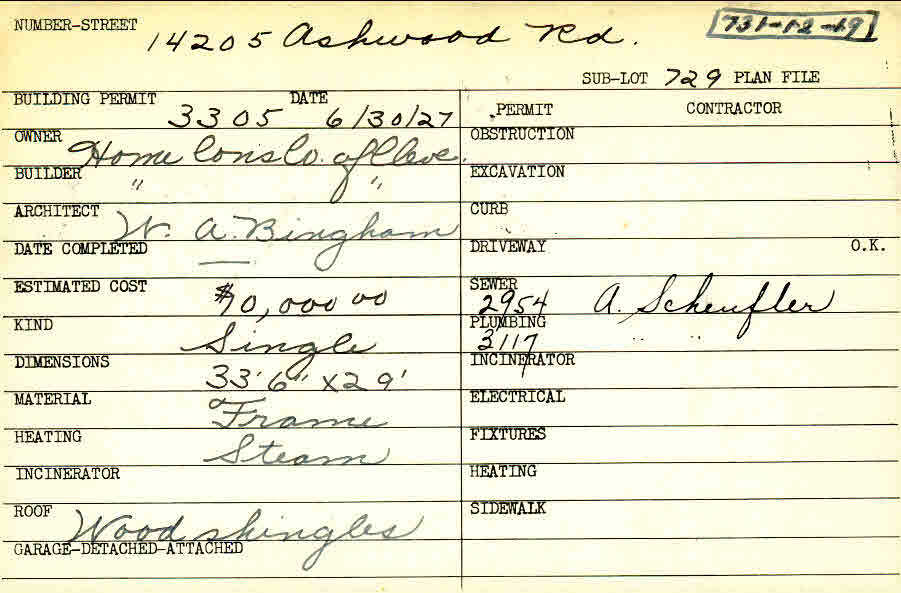 14205 Ashwood Road Shaker Heights, OH 44120 PARCEL ID: 731-12-019 Building Permit Date: 06-30-1927 Plan File Number: 5187 Microfilm Roll: Roll#70 Neighborhood: Ludlow Owner: Home Construction Company of Cleveland Builder: Home Construction Company of Cleveland Architect: Bingham, William A. Estimated Cost: 10000 Kind: Single, Single Residence or Dwelling Material: Frame Heating: Steam Roof: Wood Shingle |