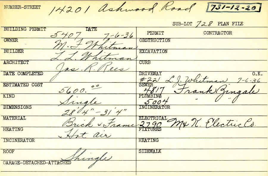 14201 Ashwood Road Shaker Heights, OH 44105 PARCEL ID: 731-12-020 Building Permit Date: 07-06-1936 Plan File Number: 0 Neighborhood: Ludlow Owner: Whitman, M. F. Builder: Whitman, L. L. Architect: Rees, James R. Estimated Cost: 5600 Kind: Single, Single Residence or Dwelling Material: Brick and Frame Heating: Hot Air Roof: Shingles |