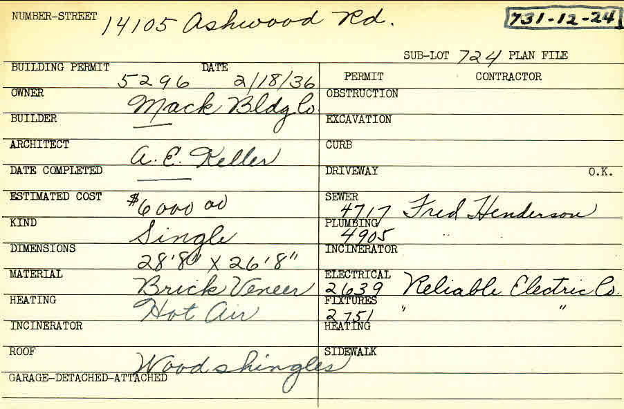 14105 Ashwood Road Shaker Heights, OH 44120 PARCEL ID: 731-12-024 Building Permit Date: 02-18-1936 Plan File Number: 0 Neighborhood: Ludlow Owner: Mack Building Company Architect: Keller, Arthur Emil Estimated Cost: 6000 Kind: Single, Single Residence or Dwelling Material: Brick Veneer Heating: Hot Air Roof: Wood Shingle |