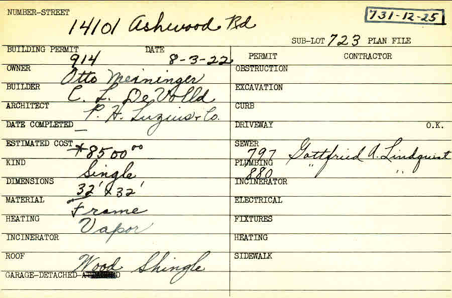 14101 Ashwood Road Shaker Heights, OH 44120 PARCEL ID: 731-12-025 Building Permit Date: 08-03-1922 Plan File Number: 0 Neighborhood: Ludlow Owner: Meininger, Otto Builder: De Volld, C. L. Architect: P. H. Luzuis and Company Estimated Cost: 8500 Kind: Single, Single Residence or Dwelling Material: Frame Heating: Vapor Roof: Wood Shingle |
