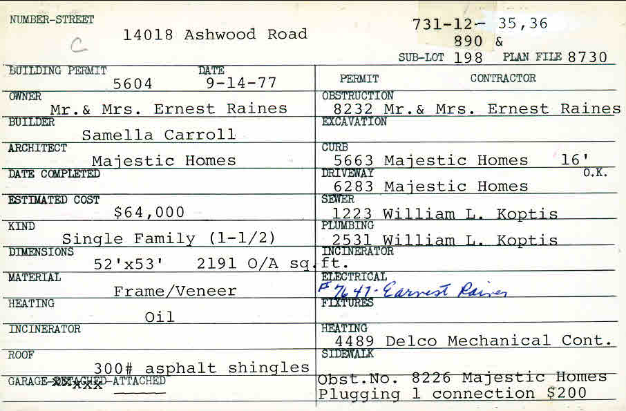 14018 Ashwood Road Shaker Heights, OH 44120 PARCEL ID: 731-12-036 Building Permit Date: 09-14-1977 Plan File Number: 8370 Microfilm Roll: Roll#98 Neighborhood: Ludlow Owner: Raines, Mr. and Mrs. Ernest Builder: Carroll, Samella Architect: Majestic Homes Estimated Cost: 64000 Kind: Single, Single Residence or Dwelling Material: Frame Roof: 300# Min Asphalt Garage: attached |