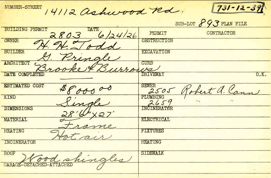 14112 Ashwood Road Shaker Heights, OH 44120 PARCEL ID: 731-12-039 Building Permit Date: 06-24-1926 Plan File Number: 0 Neighborhood: Ludlow Owner: Todd, H. H. Builder: Pringle, G. Architect: Brooke and Burrows Estimated Cost: 8000 Kind: Single, Single Residence or Dwelling Material: Frame Heating: Hot Air Roof: Wood Shingle |