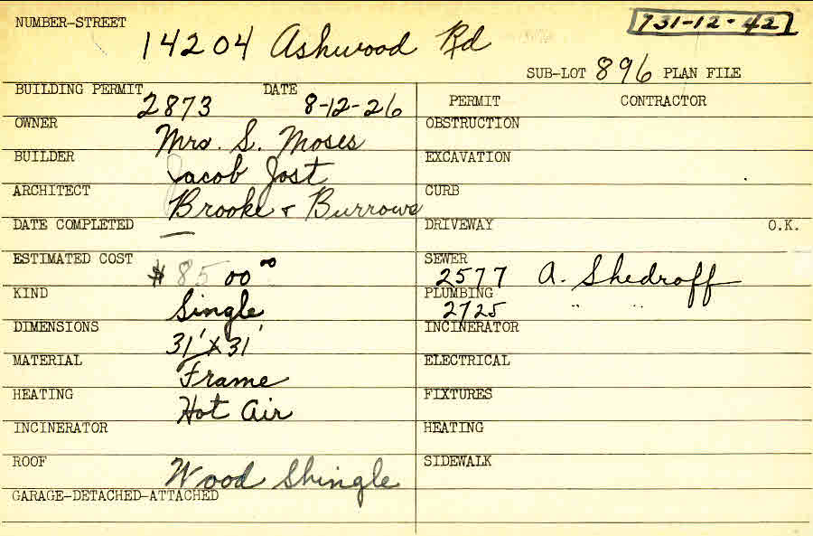 14204 Ashwood Road Shaker Heights, OH 44120 PARCEL ID: 731-12-042 Building Permit Date: 08-12-1926 Plan File Number: 3637, 10731 Microfilm Roll: Roll#54, NewRoll#5 Neighborhood: Ludlow Owner: Moses, Mrs. S. Builder: Jost, Jacob Architect: Brooke and Burrows Estimated Cost: 8500 Kind: Single, Single Residence or Dwelling Material: Frame Heating: Hot Air Roof: Wood Shingle |
