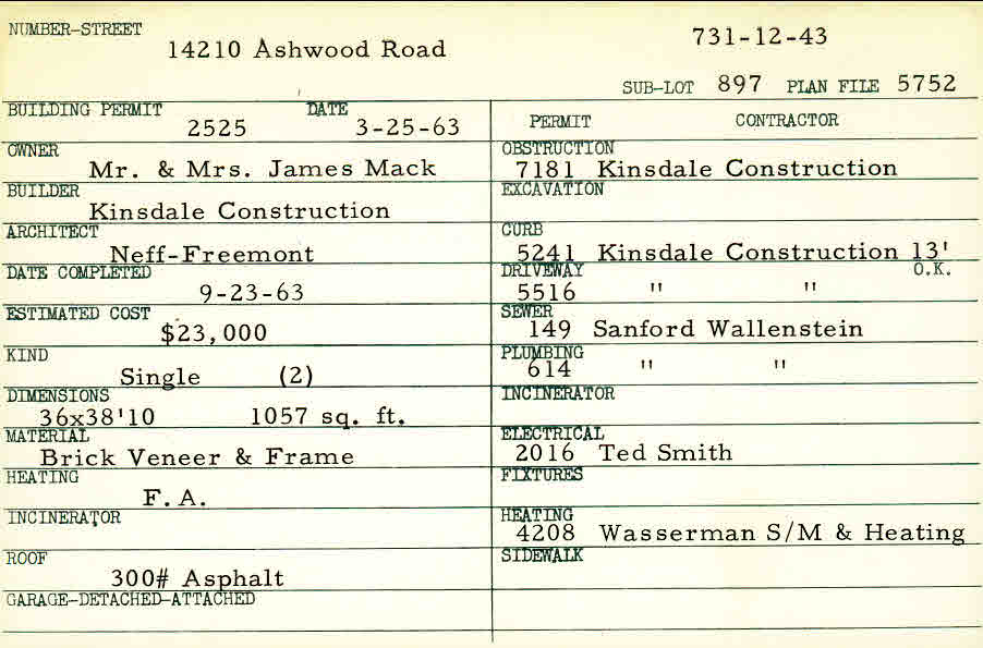 14210 Ashwood Road Shaker Heights, OH 44120 PARCEL ID: 731-12-043 Building Permit Date: 03-25-1963 Plan File Number: 5752 Microfilm Roll: Roll#78 Neighborhood: Ludlow Owner: Mack, Mr. and Mrs. James Builder: Kinsdale Construction Architect: Neff-Fremont Estimated Cost: 23000 Date Completed: 09-23-1963 Kind: Single, Single Residence or Dwelling (2) Material: Brick Veneer and Frame Heating: Forced Air Roof: 300# Min Asphalt |