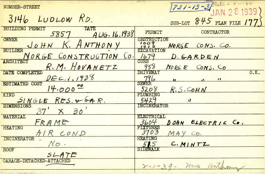 3146 Ludlow Road Shaker Heights, OH 44120 PARCEL ID: 731-13-003 Building Permit Date: 08-16-1938 Neighborhood: Ludlow Owner: Anthony, John K. Builder: Norge Construction Company Architect: Hovanetz, R. M. Estimated Cost: 14000 Date Completed: 12-01-1938 Kind: Single Dwelling and Garage Material: Frame Heating: Air Conditioned Roof: Slate Garage: attached Blueprints: no blueprints on microfilm |