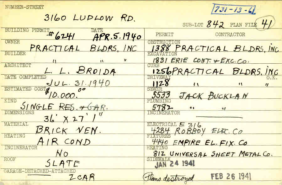 3160 Ludlow Road Shaker Heights, OH 44120 PARCEL ID: 731-13-006 Building Permit Date: 04-05-1940 Neighborhood: Ludlow Owner: Practical Builders, Inc Builder: Practical Builders, Inc Architect: Broida, L. L. Estimated Cost: 10000 Date Completed: 07-31-1940 Kind: Single Dwelling and Garage Material: Brick Veneer Heating: Air Conditioned Roof: Slate Garage: detached 2 car Blueprints: no blueprints on microfilm |