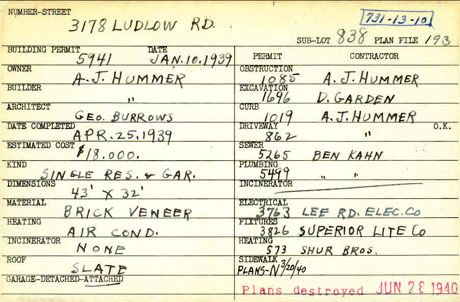 3178 Ludlow Road Shaker Heights, OH 44120 PARCEL ID: 731-13-010 Building Permit Date: 01-10-1939 Neighborhood: Ludlow Owner: Hummer, A. J. Builder: Hummer, A. J. Architect: Burrows, George Estimated Cost: 18000 Date Completed: 04-25-1939 Kind: Single Dwelling and Garage Material: Brick Veneer Heating: Air Conditioned Roof: Slate Garage: attached Blueprints: no blueprints on microfilm |