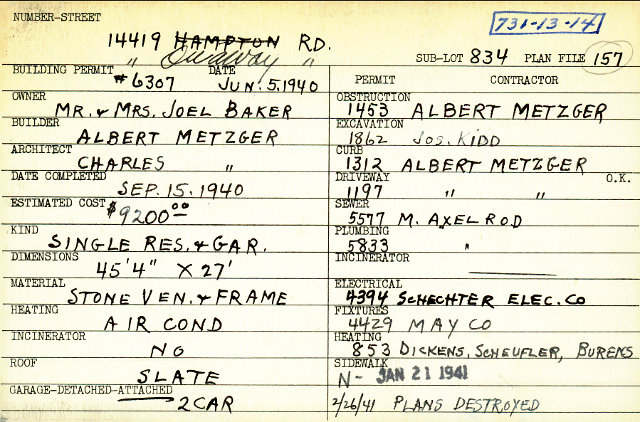 14419 Onaway Road Shaker Heights, OH 44120 PARCEL ID: 731-13-014 Building Permit Date: 06-05-1940 Neighborhood: Ludlow Owner: Baker, Mr. and Mrs. Joel Builder: Metzger, Albert Architect: Metzger, Charles A. Estimated Cost: 9200 Date Completed: 09-15-1940 Kind: Single Dwelling and Garage Material: Stone Veneer and Frame Heating: Air Conditioned Roof: Slate Garage: attached 2 car Blueprints: no blueprints on microfilm |