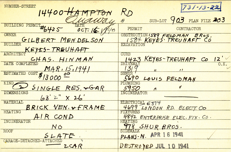 14400 Onaway Road Shaker Heights, OH 44120 PARCEL ID: 731-13-022 Building Permit Date: 10-16-1940 Plan File Number: 203, 7889 Microfilm Roll: Roll#95 Neighborhood: Ludlow Owner: Mendelson, Gilbert Builder: Keyes - Treuhaft Architect: Hinman, Charles Estimated Cost: 13000 Date Completed: 03-15-1941 Kind: Single Dwelling and Garage (2) Material: Brick Veneer and Frame Heating: Air Conditioned Roof: Slate Garage: attached 2 car |