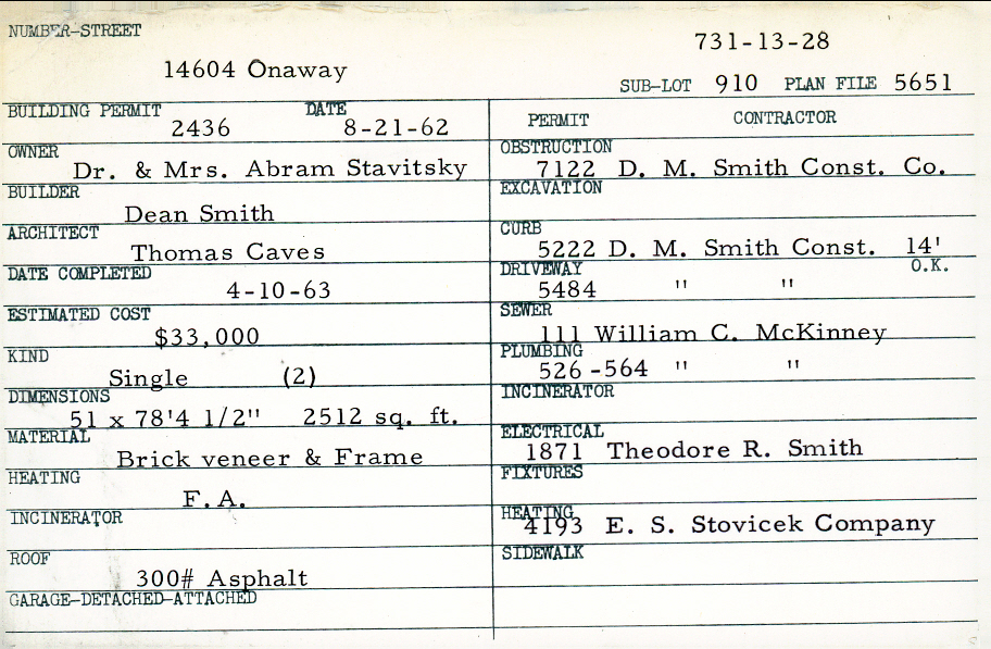 14604 Onaway Road Shaker Heights, OH 44120 PARCEL ID: 731-13-028 Building Permit Date: 08-21-1962 Plan File Number: 5651 Microfilm Roll: Roll#76 Neighborhood: Ludlow Owner: Stavitsky, Dr. and Mrs. Abram Builder: Smith, Dean Architect: Caves, Thomas Estimated Cost: 33000 Date Completed: 04-10-1963 Kind: Single, Single Residence or Dwelling (2) Material: Brick Veneer and Frame Heating: Forced Air Roof: 300# Min Asphalt |