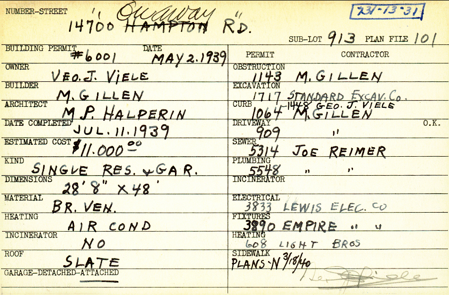 14700 Onaway Road Shaker Heights, OH 44120 PARCEL ID: 731-13-031 Building Permit Date: 05-02-1939 Neighborhood: Ludlow Owner: Viele, Veo J. Builder: Gillen, M. Architect: Halperin, M. P. Estimated Cost: 11000 Date Completed: 07-11-1939 Kind: Single Dwelling and Garage Material: Brick Veneer Heating: Air Conditioned Roof: Slate Garage: attached Blueprints: no blueprints on microfilm |
