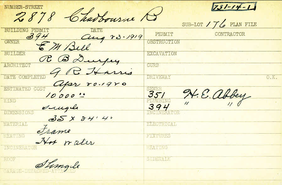 2878 Chadbourne Road Shaker Heights, OH 44120 PARCEL ID: 731-14-001 Building Permit Date: 08-23-1919 Plan File Number: 0 Neighborhood: Boulevard Owner: Bell, E. M. Builder: Durfey, R. B. Architect: Harris, A. R. Estimated Cost: 10000 Date Completed: 04-20-1920 Kind: Single, Single Residence or Dwelling Material: Frame Heating: Hot Water Roof: Shingles |