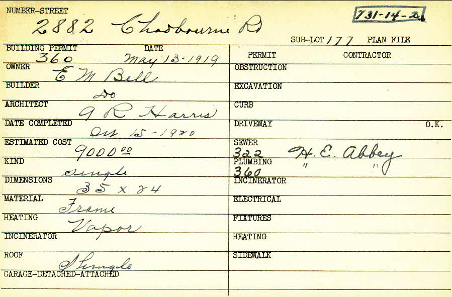 2882 Chadbourne Road Shaker Heights, OH 44120 PARCEL ID: 731-14-002 Building Permit Date: 05-13-1919 Plan File Number: 10726 Microfilm Roll: NewRoll#5 Neighborhood: Boulevard Owner: Bell, E. M. Builder: Bell, E. M. Architect: Harris, A. R. Estimated Cost: 9000 Date Completed: 10-15-1920 Kind: Single, Single Residence or Dwelling Material: Frame Heating: Vapor Roof: Shingles |