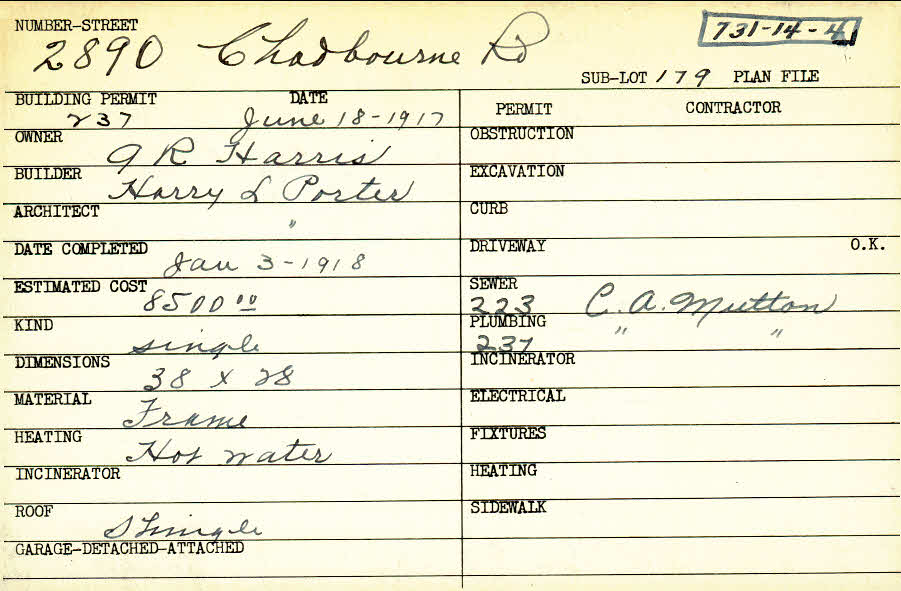 2890 Chadbourne Road Shaker Heights, OH 44120 PARCEL ID: 731-14-004 Building Permit Date: 06-18-1917 Plan File Number: 0 Neighborhood: Boulevard Owner: Harris, A. R. Builder: Porter, Harry L. Architect: Porter, Harry L. Estimated Cost: 8500 Date Completed: 01-03-1918 Kind: Single, Single Residence or Dwelling Material: Frame Heating: Hot Water Roof: Shingles |