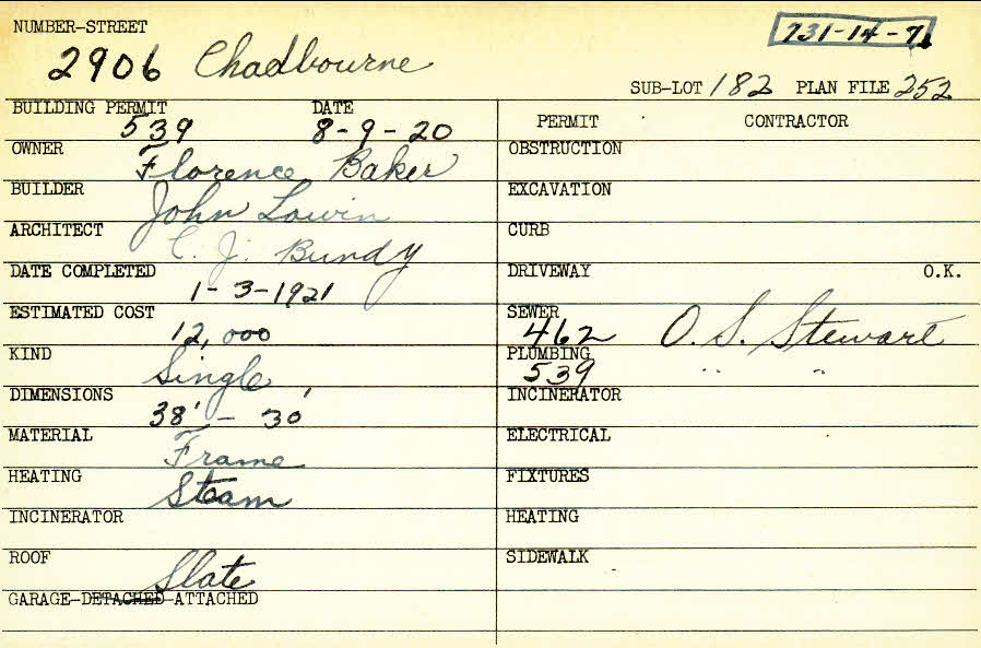 2906 Chadbourne Road Shaker Heights, OH 44120 PARCEL ID: 731-14-007 Building Permit Date: 08-09-1920 Plan File Number: 252, 4824, 5170 Microfilm Roll: Roll#66, Roll#70 Neighborhood: Boulevard Owner: Baker, Florence Builder: Lowin, John Architect: Bundy, C. J. Estimated Cost: 12000 Date Completed: 01-03-1921 Kind: Single, Single Residence or Dwelling Material: Frame Heating: Steam Roof: Slate Garage: attached |