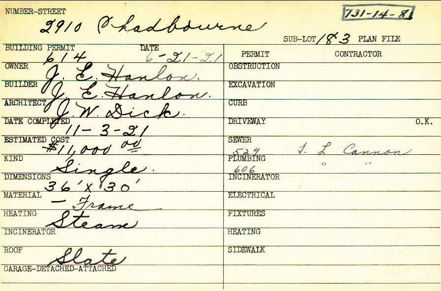 2910 Chadbourne Road Shaker Heights, OH 44120 PARCEL ID: 731-14-008 Building Permit Date: 06-21-1921 Plan File Number: 0 Neighborhood: Boulevard Owner: Hanlon, J. E. Builder: Hanlon, J. E. Architect: Dick, J. W. Estimated Cost: 11000 Date Completed: 11-03-1921 Kind: Single, Single Residence or Dwelling Material: Frame Heating: Steam Roof: Slate |