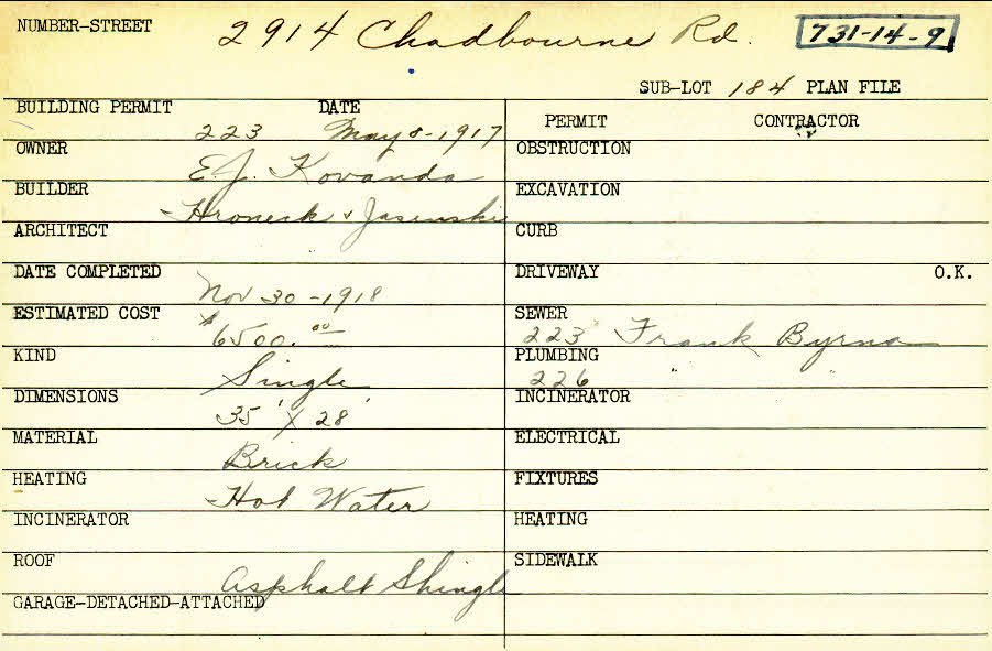 2914 Chadbourne Road Shaker Heights, OH 44120 PARCEL ID: 731-14-009 Building Permit Date: 05-08-1917 Plan File Number: 12601, 92-145* Microfilm Roll: NewRoll#14, NewRoll#16 Neighborhood: Boulevard Owner: Kovanda, E. J. Builder: Hroneck and Jasinski Architect: Hroneck and Jasinski Estimated Cost: 6500 Date Completed: 11-30-1918 Kind: Single, Single Residence or Dwelling Material: Brick Heating: Hot Water Roof: Asphalt Shingles |