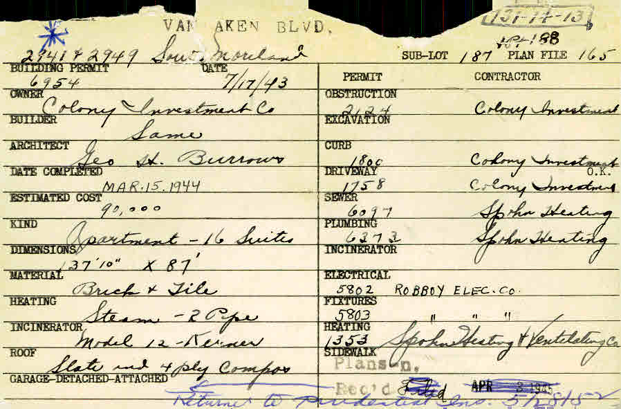 2941 Van Aken Boulevard Shaker Heights, OH 44120 PARCEL ID: 731-14-013 Building Permit Date: 07-17-1943 Plan File Number: 117 all scanned Microfilm Roll: Roll001 Owner: Colony Investment Company Builder: Colony Investment Company Architect: Burrows, George H. Estimated Cost: 90000 Date Completed: 03-15-1944 Kind: Apartment or Multi-family (3+) Material: Brick and Tile Heating: Steam Roof: Slate |