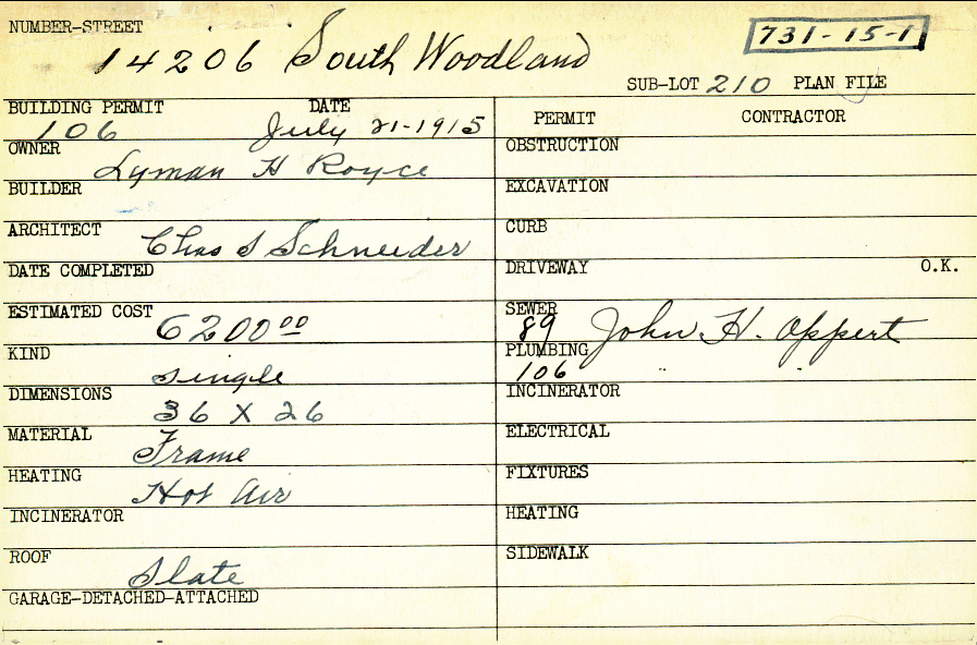 14206 South Woodland Road Shaker Heights, OH 44120 PARCEL ID: 731-15-001 Building Permit Date: 07-21-1915 Plan File Number: 7920 Microfilm Roll: Roll#95 Neighborhood: Boulevard Owner: Royce, Lyman H. Architect: Schneider, Charles S. Estimated Cost: 6200 Kind: Single, Single Residence or Dwelling Material: Frame Heating: Hot Air Roof: Slate |