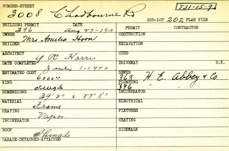 3008 Chadbourne Road Shaker Heights, OH 44120 PARCEL ID: 731-15-009 Building Permit Date: 08-27-1919 Plan File Number: 0 Neighborhood: Onaway Owner: Hoon, Amelia Mrs. Architect: Harris, A. R. Estimated Cost: 6000 Date Completed: 07-01-1920 Kind: Single, Single Residence or Dwelling Material: Frame Heating: Vapor Roof: Shingles |