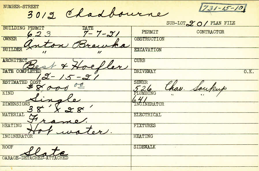 3012 Chadbourne Road Shaker Heights, OH 44120 PARCEL ID: 731-15-010 Building Permit Date: 07-07-1921 Plan File Number: 5391 Microfilm Roll: Roll#73 Neighborhood: Onaway Owner: Brewka, Anton Builder: Brewka, Anton Architect: Best and Hoefler Estimated Cost: 8000 Date Completed: 12-15-1921 Kind: Single, Single Residence or Dwelling Material: Frame Heating: Hot Water Roof: Slate |