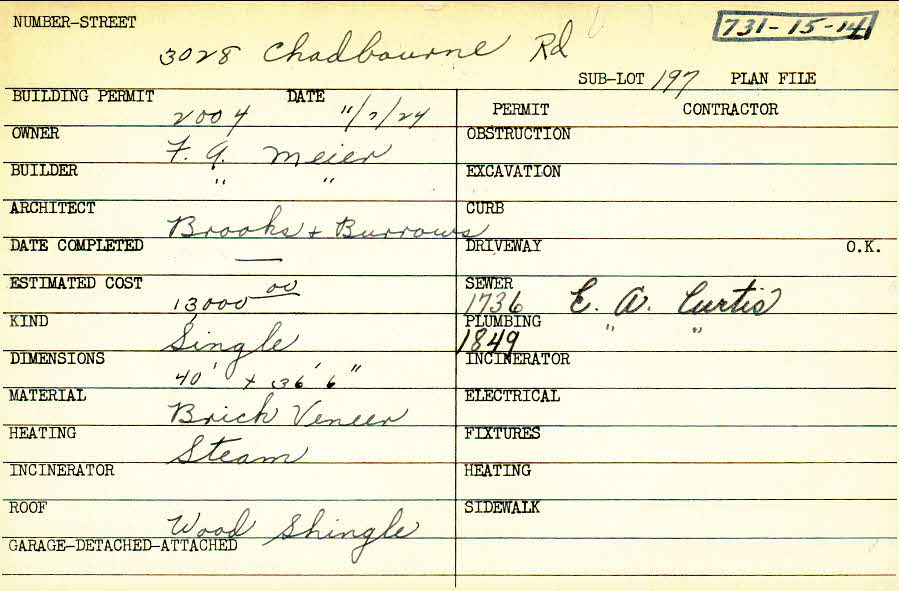 3028 Chadbourne Road Shaker Heights, OH 44120 PARCEL ID: 731-15-014 Building Permit Date: 11-07-1924 Plan File Number: 0 Owner: Meier, F. A. Builder: Meier, F. A. Architect: Brooke and Burrows Estimated Cost: 13000 Kind: Single, Single Residence or Dwelling Material: Brick Veneer Heating: Steam Roof: Wood Shingle |