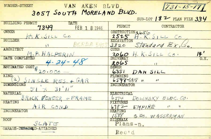 3057 Van Aken Boulevard Shaker Heights, OH 44120 PARCEL ID: 731-15-017 Building Permit Date: 02-18-1946 Plan File Number: 334 all scanned Microfilm Roll: Roll004 Neighborhood: Onaway Owner: H. K. Sill Company Builder: H. K. Sill Compnay Architect: Halperin, M. P. Estimated Cost: 20000 Date Completed: 04-24-1948 Kind: Single Dwelling and Garage (2) Material: Brick Veneer and Frame Heating: Air Conditioned Roof: Slate Garage: attached |