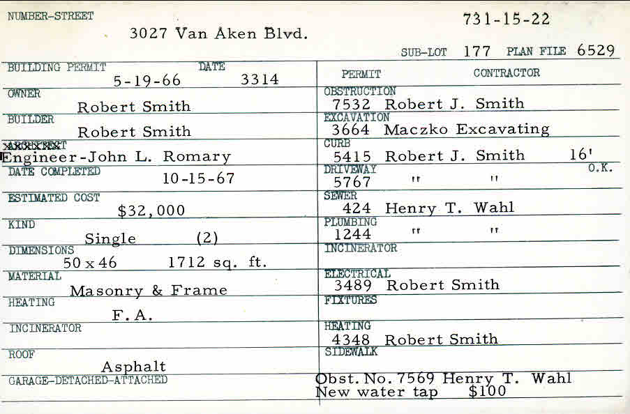 3027 Van Aken Boulevard Shaker Heights, OH 44120 PARCEL ID: 731-15-022 Building Permit Date: 05-19-1966 Plan File Number: 6529 Microfilm Roll: Roll#86 Neighborhood: Onaway Owner: Smith, Robert Builder: Smith, Robert Architect: Romary, John L. (Engineer) Estimated Cost: 32000 Date Completed: 10-15-1967 Kind: Single, Single Residence or Dwelling (2) Material: Masonry and Frame Heating: Forced Air Roof: Asphalt |