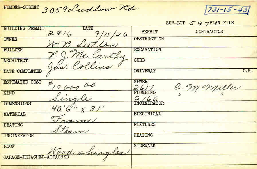 3059 Ludlow Road Shaker Heights, OH 44120 PARCEL ID: 731-15-043 Building Permit Date: 09-15-1926 Plan File Number: 0 Neighborhood: Ludlow Owner: Lutton, W. B. Builder: McCarthy, P. J. Architect: Collins, James Estimated Cost: 10000 Kind: Single, Single Residence or Dwelling Material: Frame Heating: Steam Roof: Wood Shingle Card Available: yes |