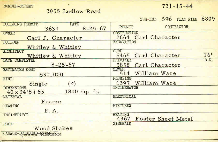 3055 Ludlow Road Shaker Heights, OH 44120 PARCEL ID: 731-15-044 Building Permit Date: 08-25-1967 Plan File Number: 6809 all scanned Microfilm Roll: Roll088 Neighborhood: Ludlow Owner: Character, Carl J. Builder: Whitley and Whitley Architect: Whitley and Whitley Estimated Cost: 30000 Date Completed: 08-25-1967 Kind: Single, Single Residence or Dwelling (2) Material: Frame Heating: Forced Air Roof: Wood Shakes Garage: detached Blueprints: online, see link above |